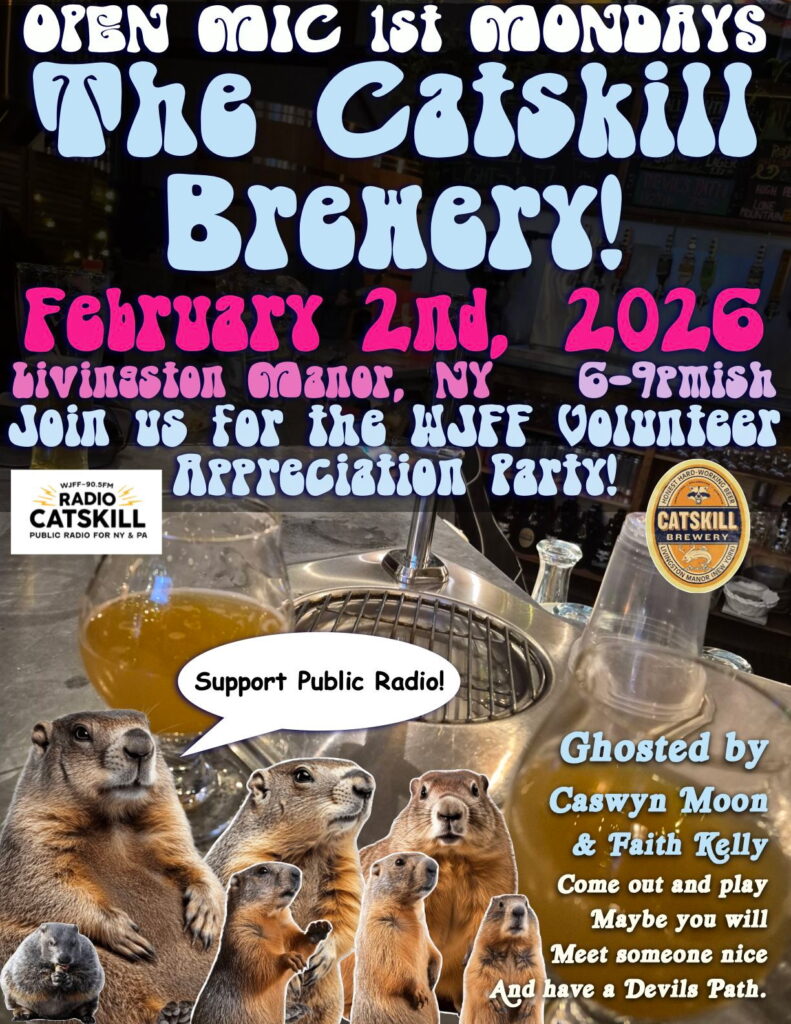 Join us Monday February 2nd 2026 from 6-9pm an Open Mic and WJFF Radio DJ Appreciation Party with Caswyn Moon and Faith Kelley! Everyone’s welcome and there’s no need to sign up, just come on down for brews, pizza and great vibes.